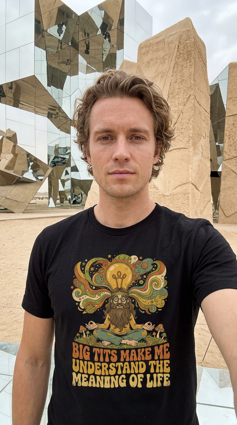 Some search for enlightenment through meditation. Others through philosophy. But this guy discovered the ultimate truth: big tits. This hilarious psychedelic-style design mixes hippie vibes, cosmic enlightenment, and bold adult humor for a truly unforgettable punchline.